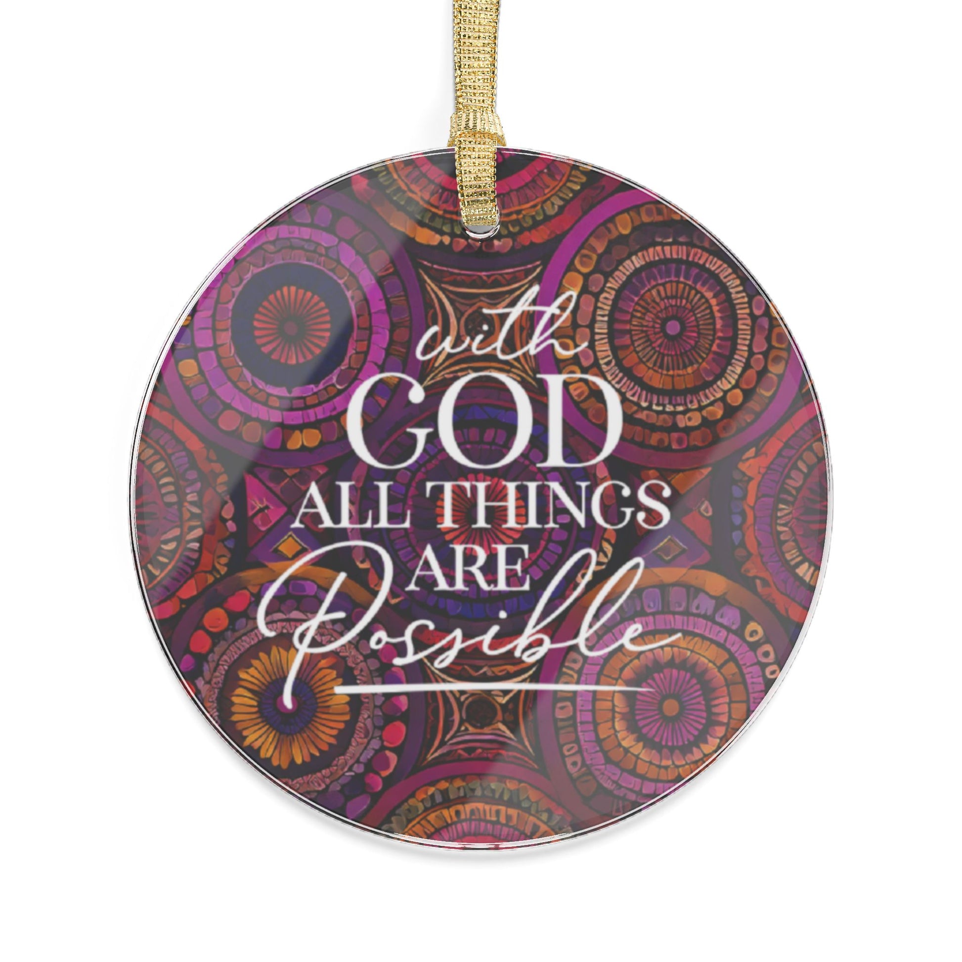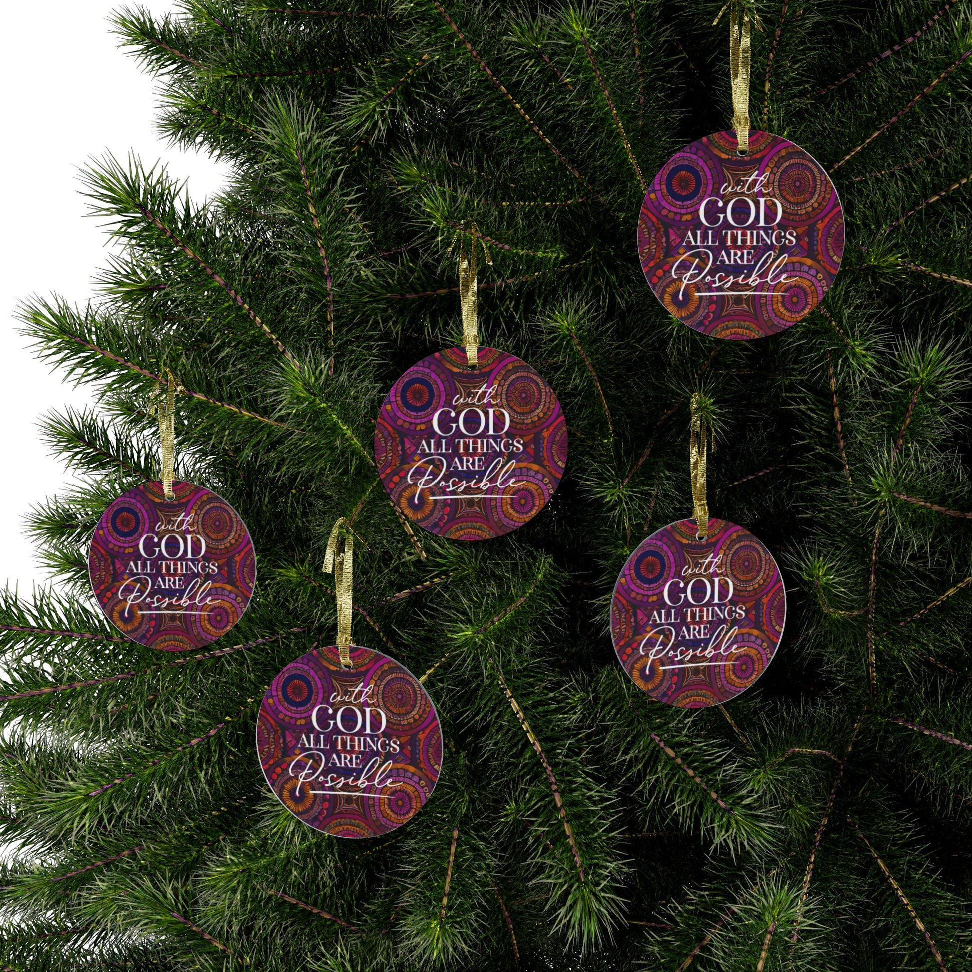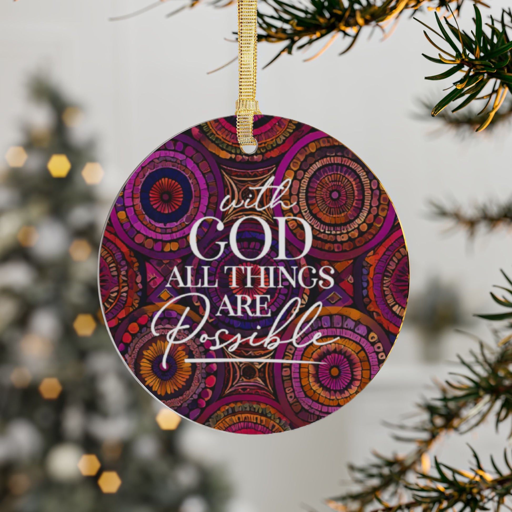 Bring some bold faith and vibrant culture to your holiday tree with our "With God All Things Are Possible" ornament. Showcasing a gorgeous African-inspired design of bold, radiant circles, this piece celebrates the beauty of belief and possibility. Made from clear acrylic with a glossy finish, it’s as durable as it is dazzling. Whether it’s gracing your tree, adorning a wreath, or brightening up a special corner, this ornament is a reminder of the power of faith. Complete with a gold ribbon for effortless hanging, it’s available as a single piece or in bundles of 5, 10, or 25—perfect for gifting or sharing the love.