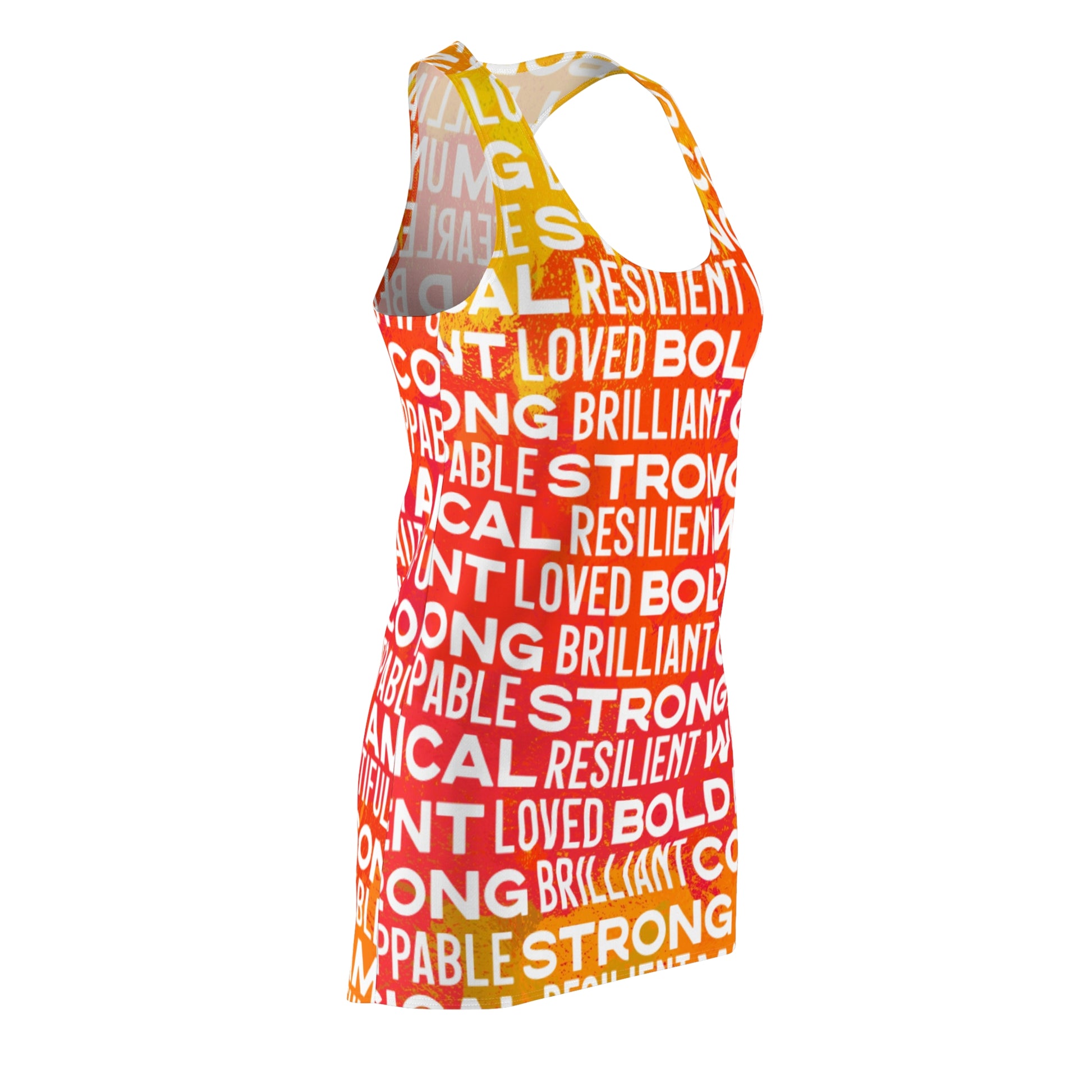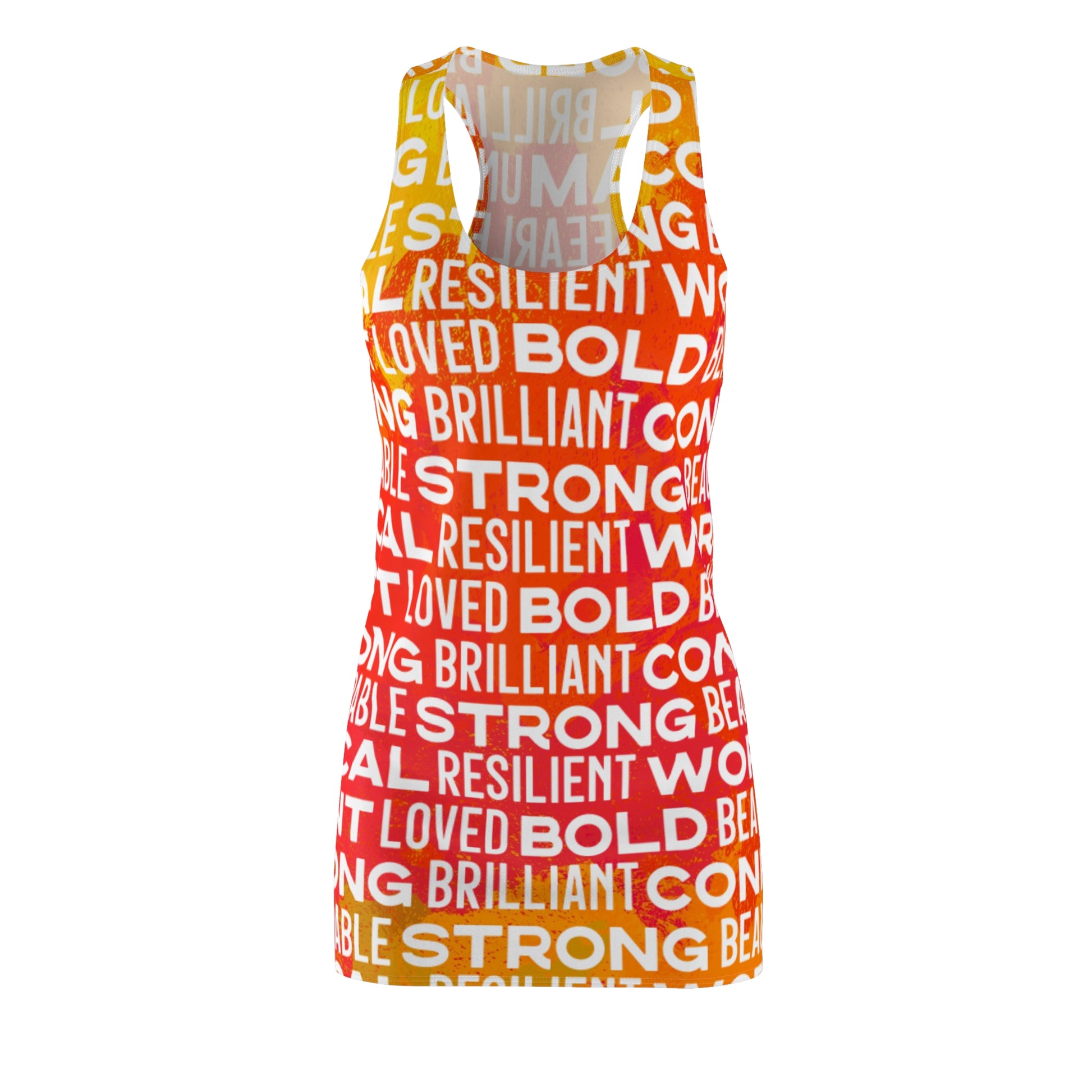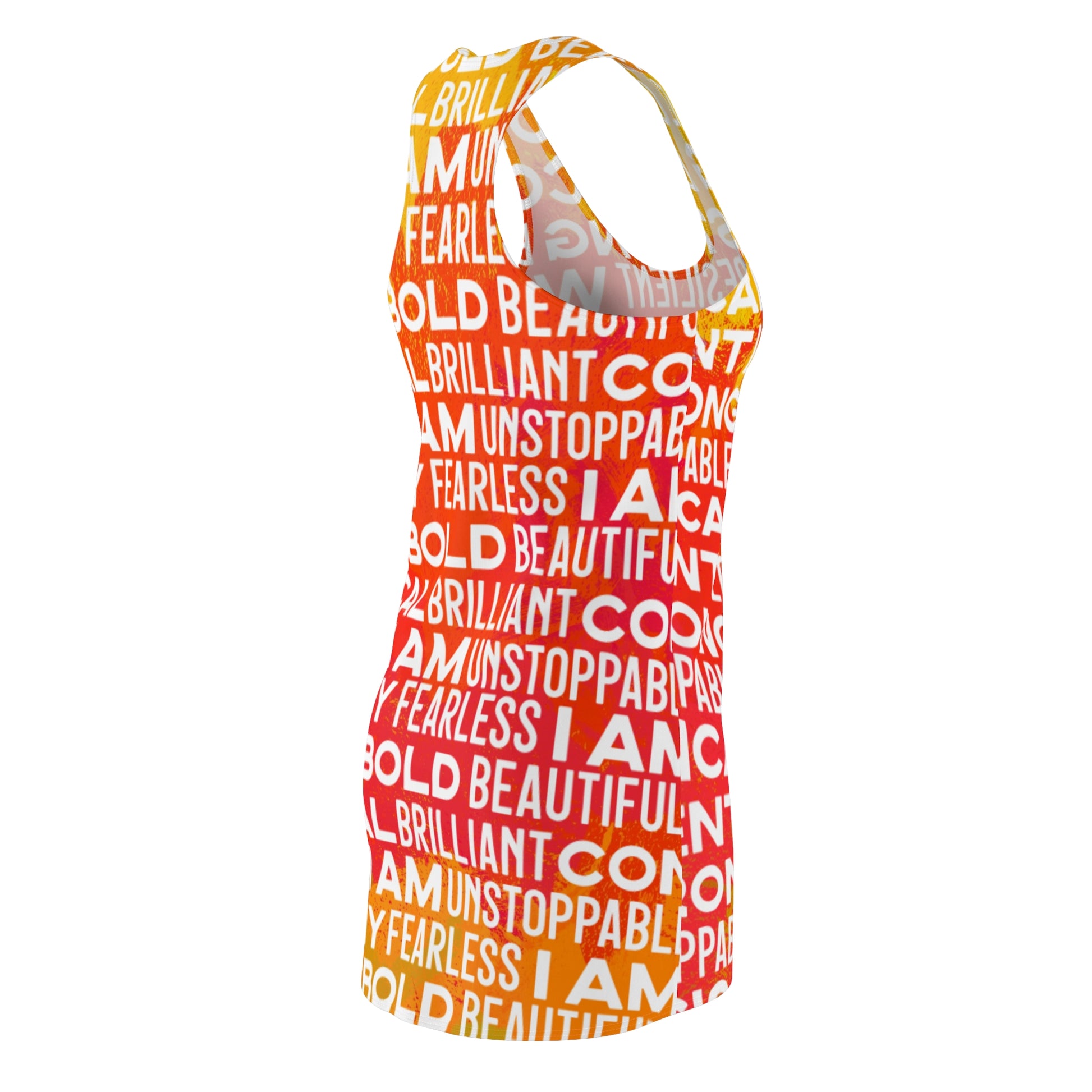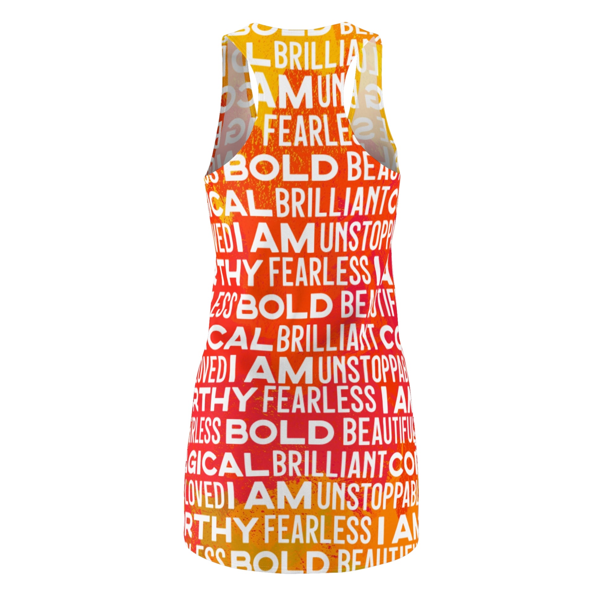 Step out and own your power with our Bold Affirmations racerback dress in Sunrise! Featuring powerful words, this dress is more than just fashion—it's a mood booster and mindset shifter. Affirmations aren’t just words, Sis; they have power and are the keys to unlocking your greatness. Made from top-quality 100% polyester fabric, this dress keeps you feeling cool and collected while you conquer the day. Rock it during lunch with the ladies or on a night out, and let those affirmations remind you of your magic.