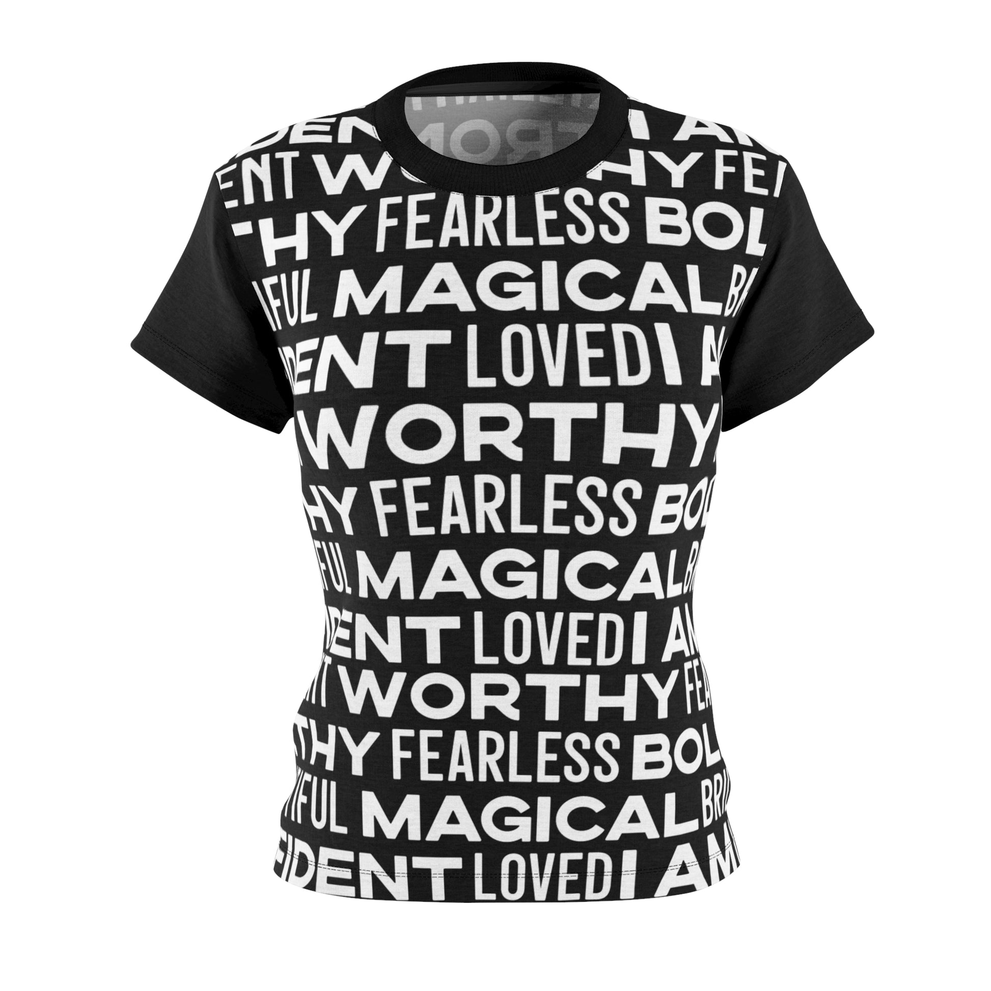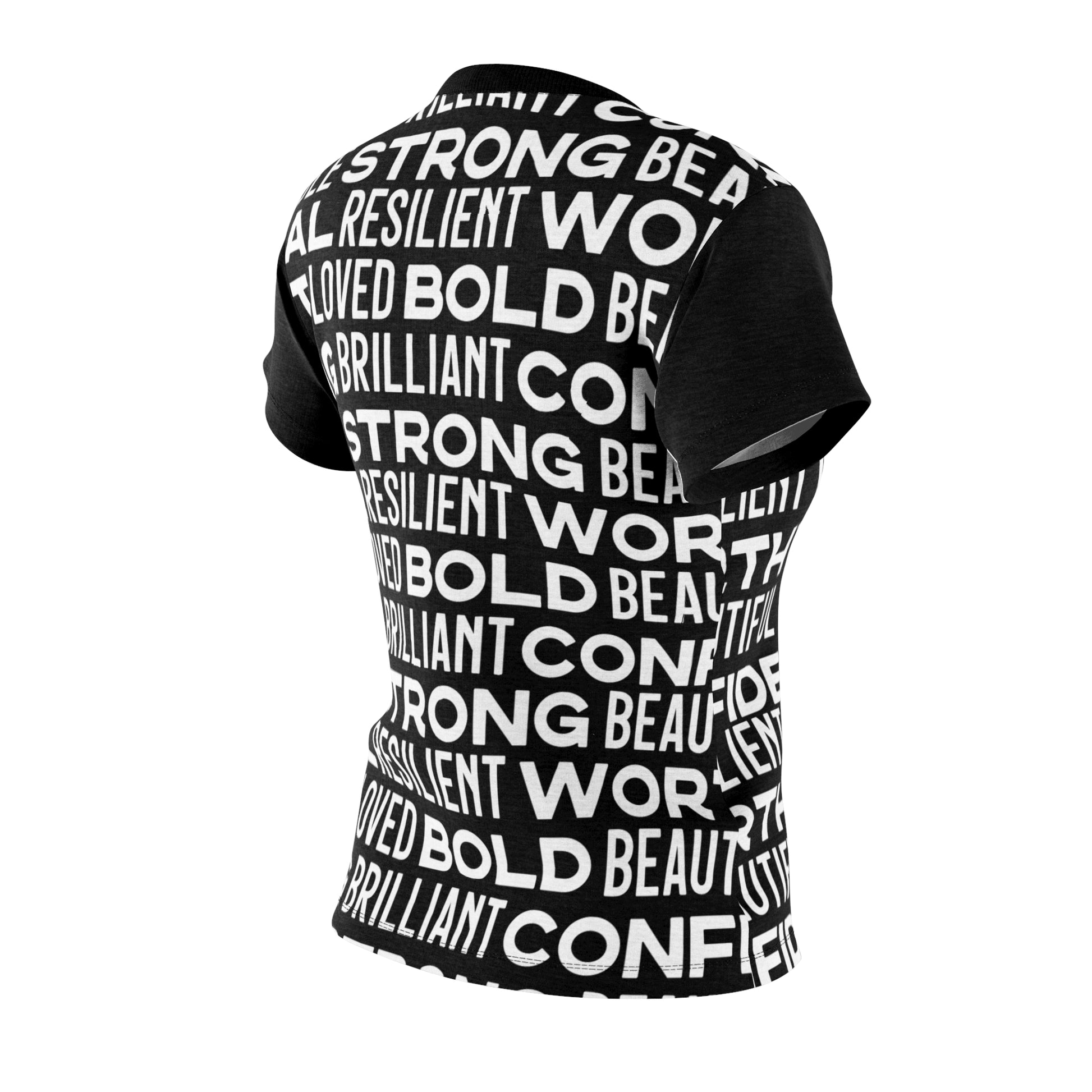 Level up your style game with our Bold Affirmations shirt in black! Each word on this shirt is a daily dose of encouragement. Affirmations aren’t just words; they're game-changers with the power to boost your mood and mindset. Made from 100% polyester, this shirt feels like a dream, keeping you comfy and fierce all day long. Plus, it fits just right and is tagless for that extra level of chill. Wherever you go, let this shirt remind you of your unstoppable greatness—it's your secret weapon to owning every room you walk into.