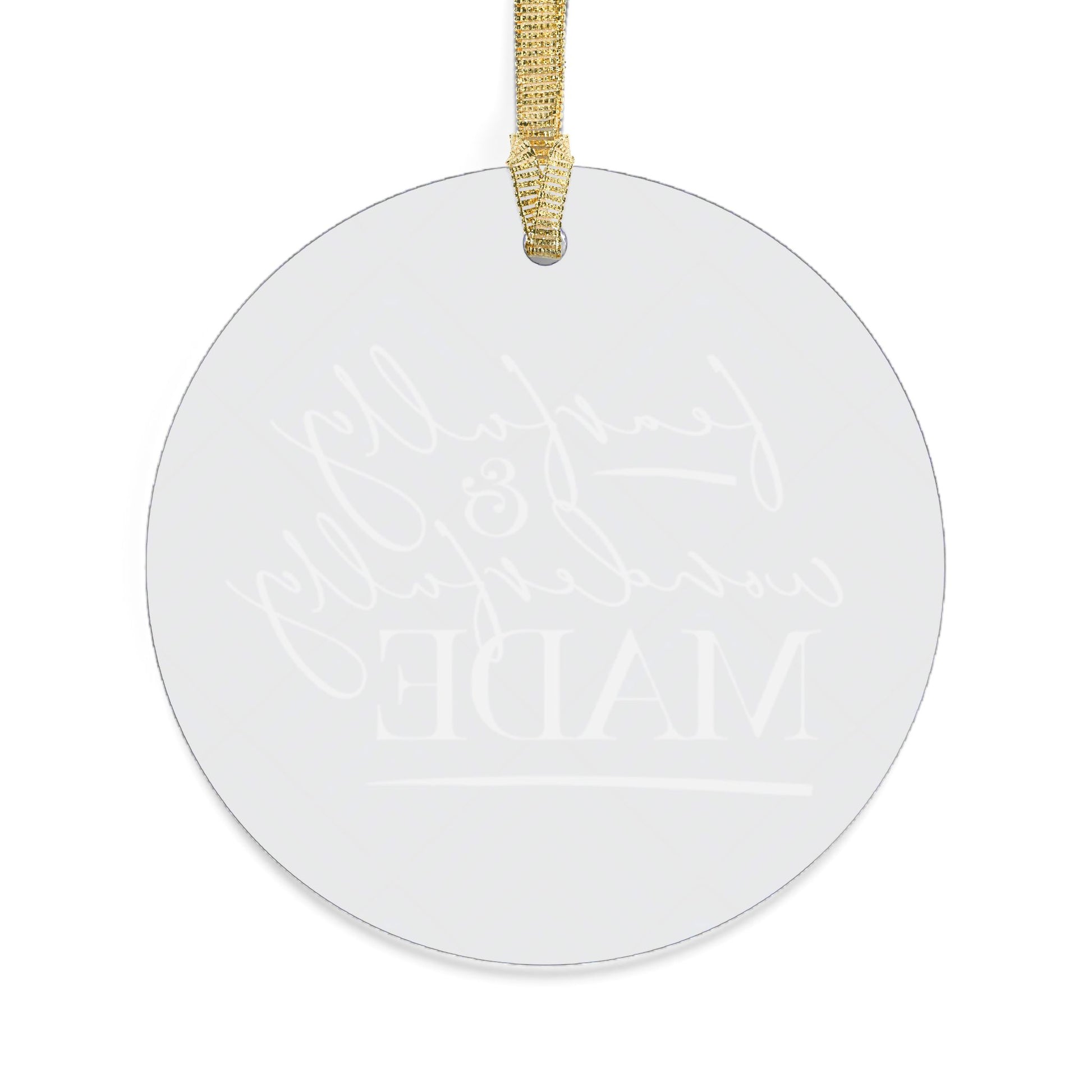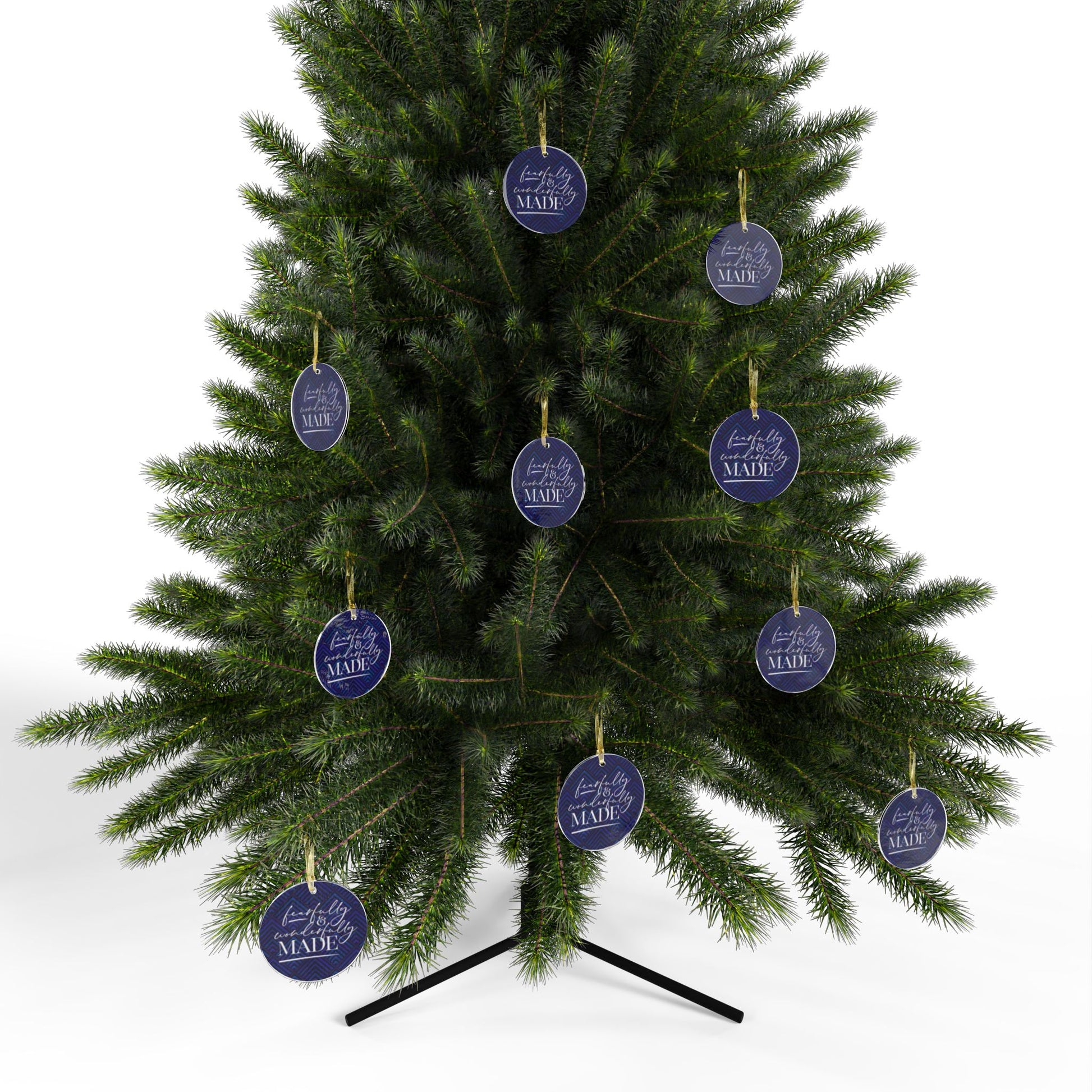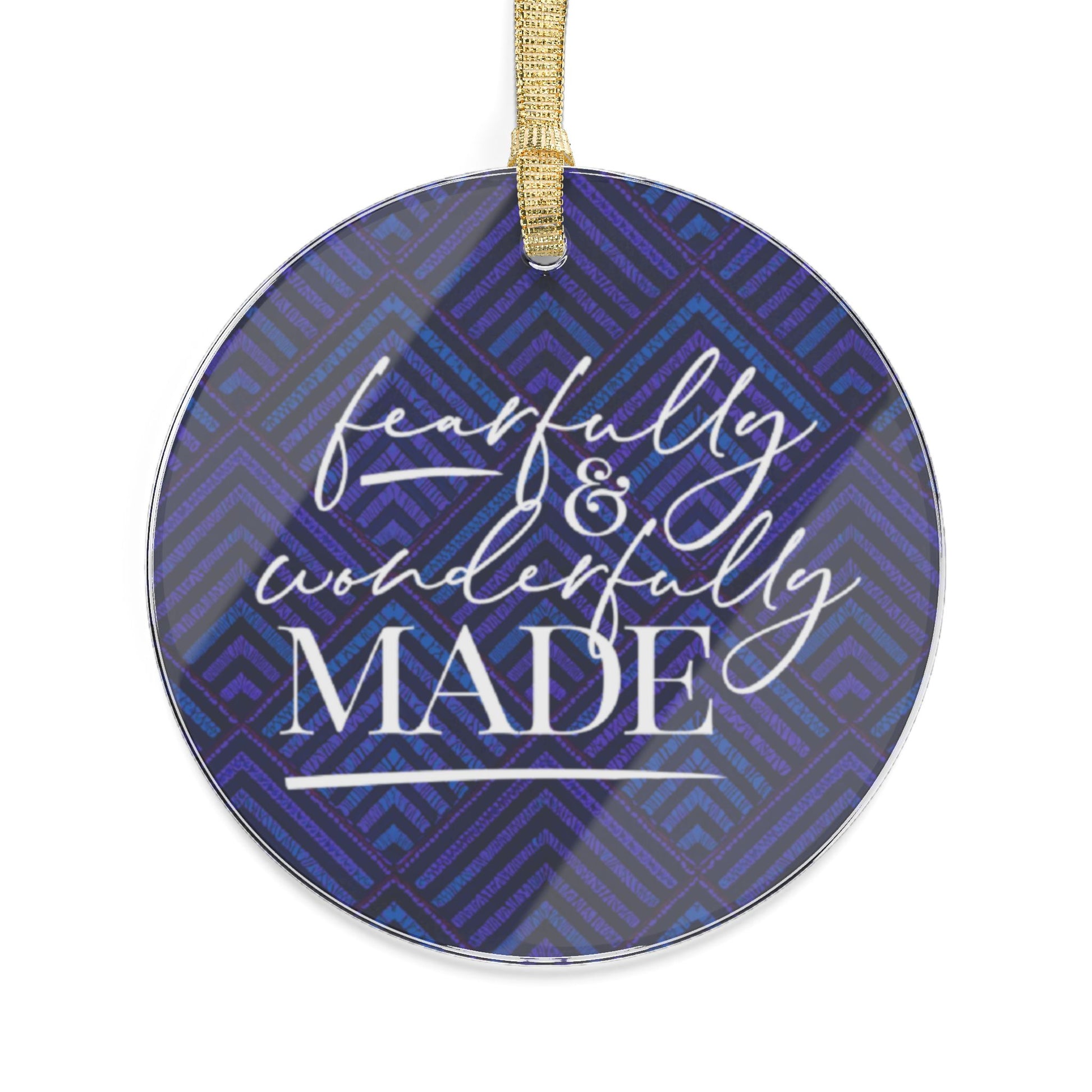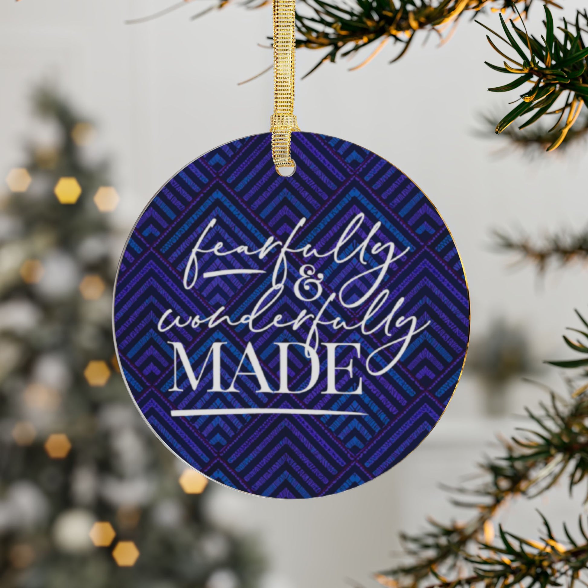 Celebrate the beauty and brilliance within you with our "Fearfully and Wonderfully Made" ornament. Featuring an African-inspired geometric pattern in rich shades of blue and purple, this piece is a vibrant reminder of your unique strength and divine creation. Made from durable, clear acrylic with a glossy finish, it adds a bold and soulful touch to your holiday tree, wreath, or favorite nook. Complete with a gold ribbon for easy hanging, this ornament is a reflection of your essence and a reminder of your worth. Whether as a personal keepsake or a heartfelt gift, it’s perfect for spreading joy, faith, and culture this holiday season.