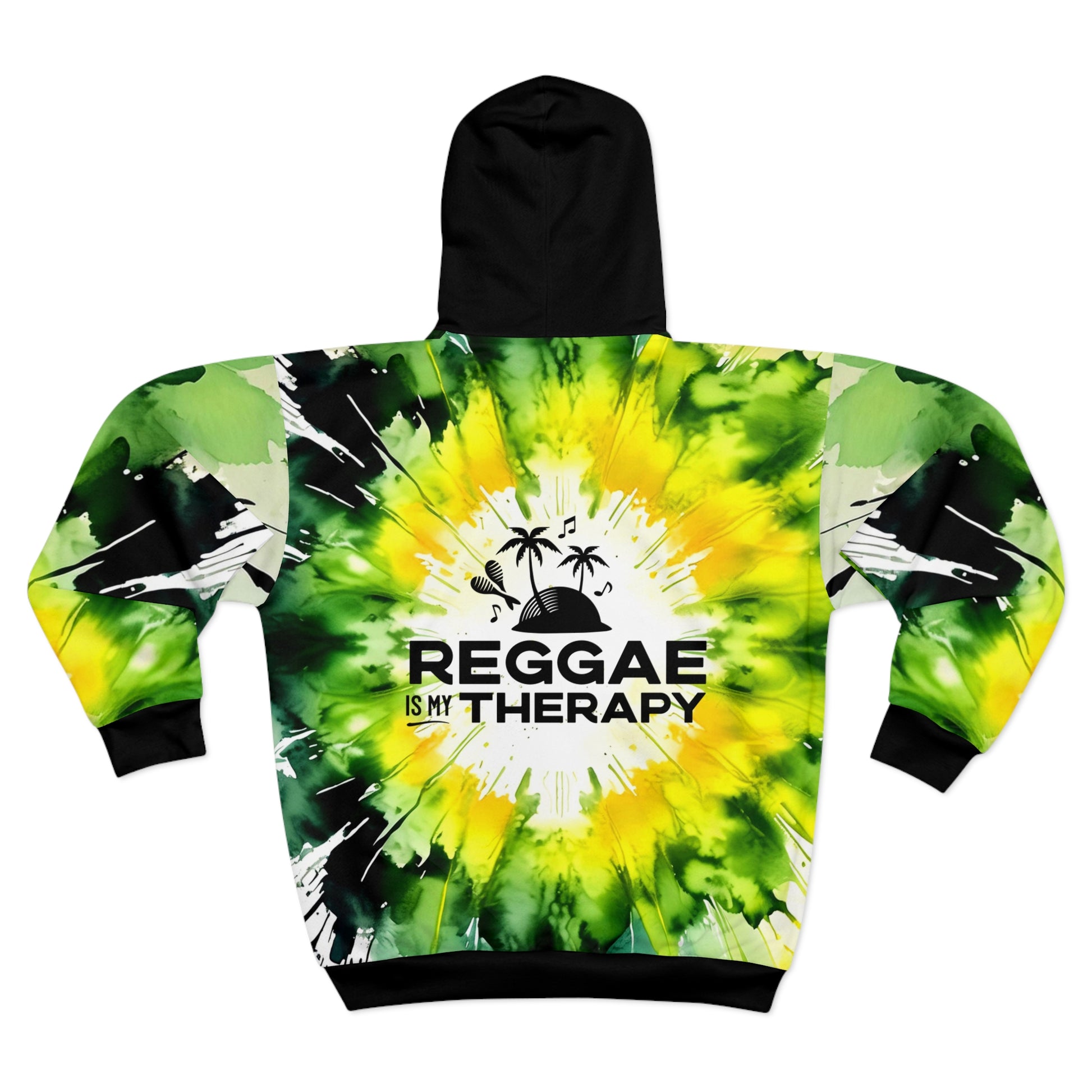 Wrap yourself in the soulful vibes of reggae with our custom 'Reggae is My Therapy' tie-dye hoodie, a colorful homage to the uplifting melodies and rhythmic beats of reggae music. Designed with the iconic colors of the Jamaican flag, this hoodie isn't just a piece of clothing—it's a statement of self-expression and healing. Crafted for comfort and style, this zipped fleece jacket features a roomy hood, a large front pocket, and a custom cut and sewn design that ensures a perfect fit.